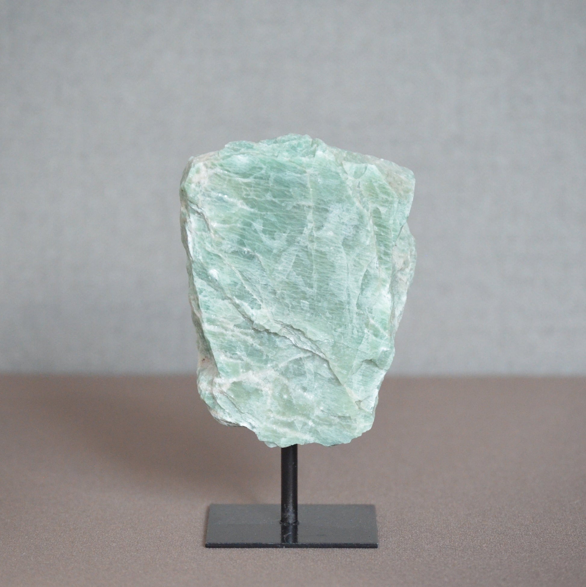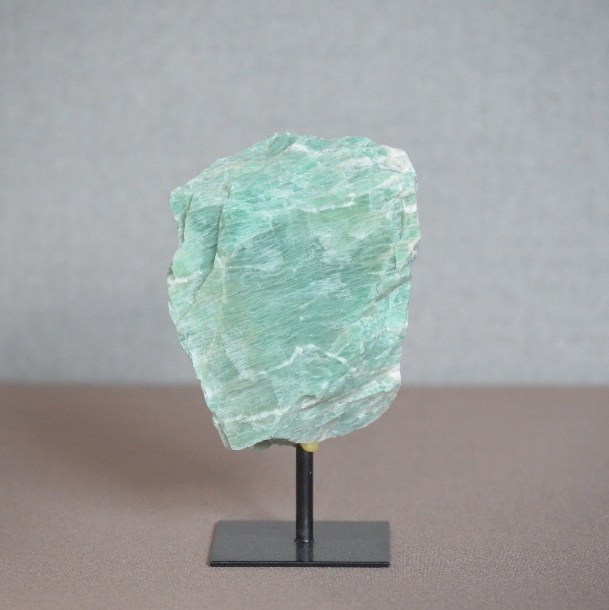 Op een standaard voegt amazoniet een natuurlijke en rustgevende tint toe aan elk interieur. Perfect als decoratief stuk op een bureau of plank voor een frisse, serene uitstraling.