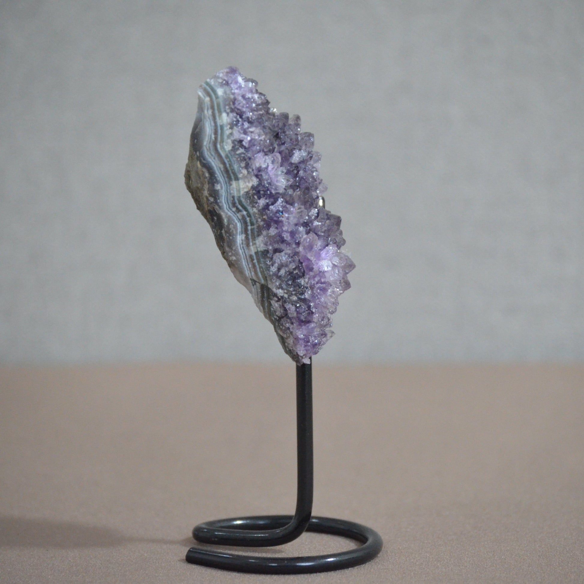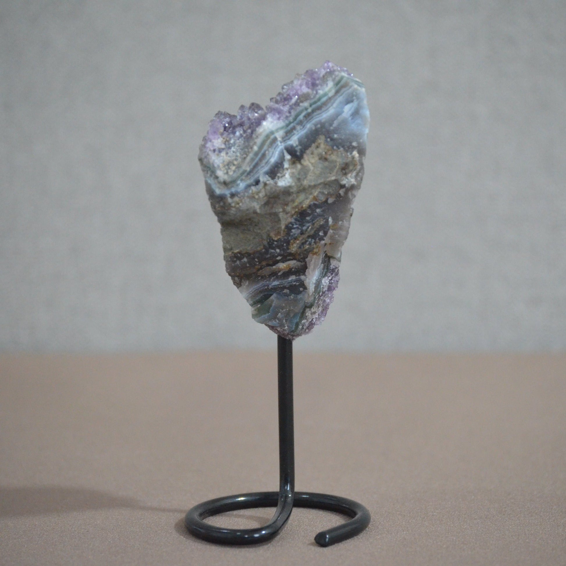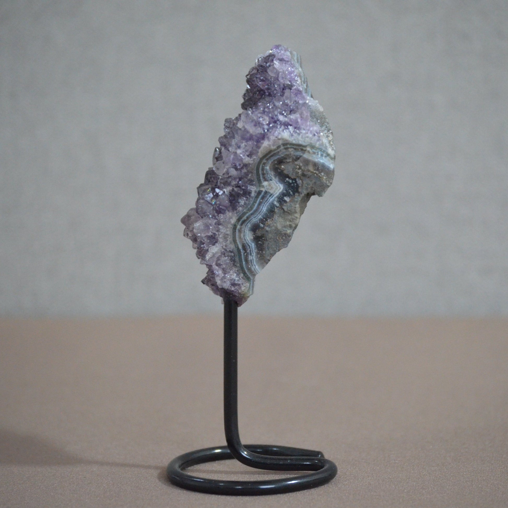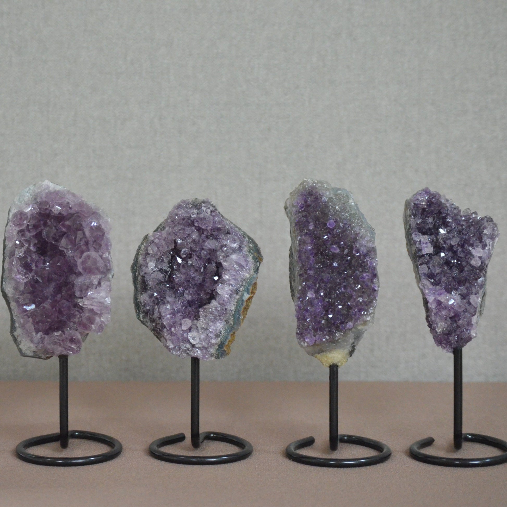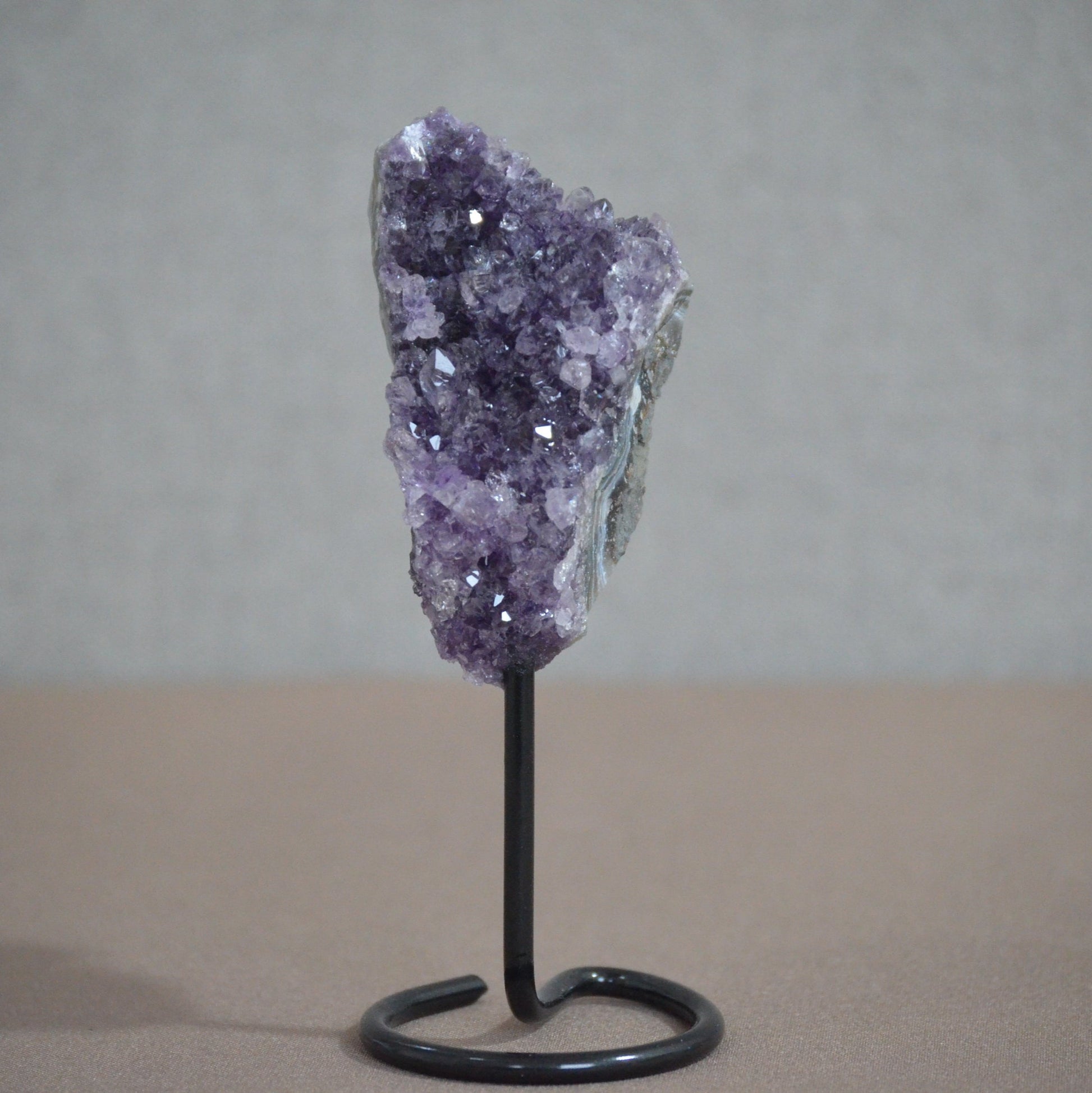 Amethist staat bekend om zijn kalmerende werking, bevordert innerlijke rust en helpt bij het loslaten van negatieve energie. Het is een ideale steen om stress te verminderen en het emotionele evenwicht te herstellen. Op deze standaard komt de amethist mooi tot zijn recht en trekt het de aandacht als stijlvolle blikvanger in elk interieur. Het past perfect in zowel moderne als rustieke inrichtingen, waar het een serene en natuurlijke sfeer toevoegt.