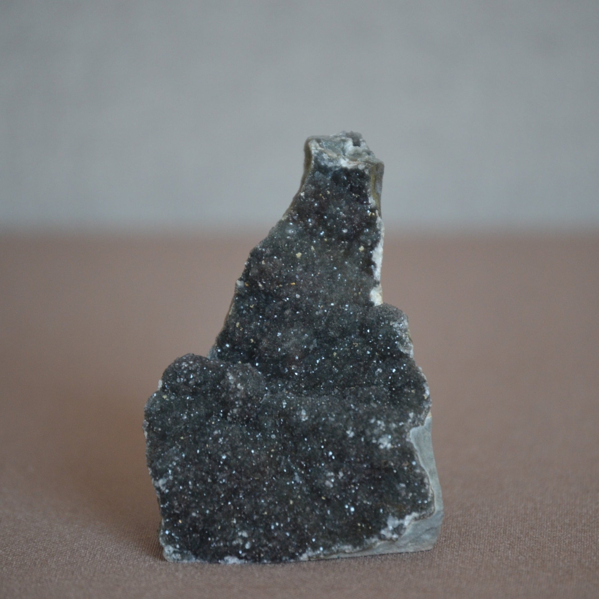 Deze glinsterende steen uit Uruguay voegt een subtiele, sprankelende schoonheid toe aan elk interieur. Ideaal voor op een bureau of plank, waar het een kalme en verfijnde sfeer creëert.